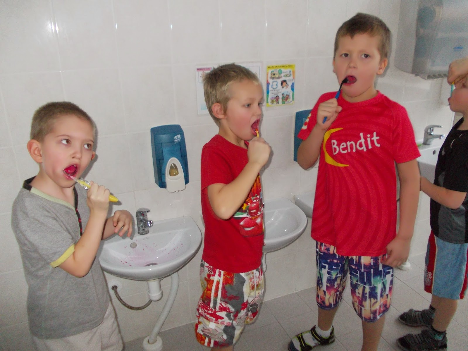 Appi tuli meile meie tervisetöötaja õpetaja Piret. Tema vaiksel ja rahulikul juhendamisel pesime hambaid ning vaatasime multifilmi, milles Juss ei soovinud endale hambaauke. Hambapesu kukkus välja lõbus. eelnevalt määrisime laste suud roosaks, et oleks näha, kust hambapesu veidi hooletult välja tuli. Lastele tegid roosad keeled hiljem palju nalja.